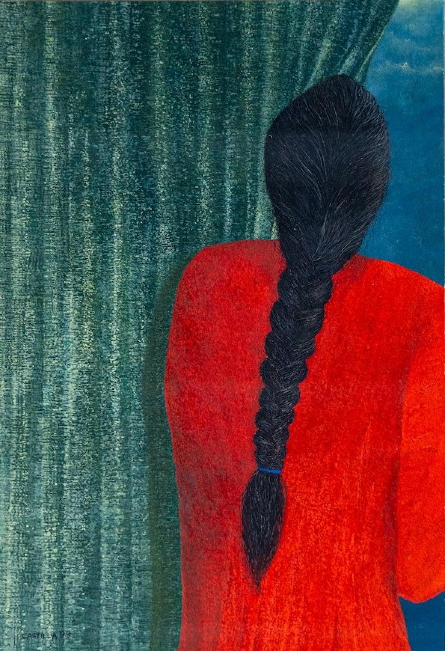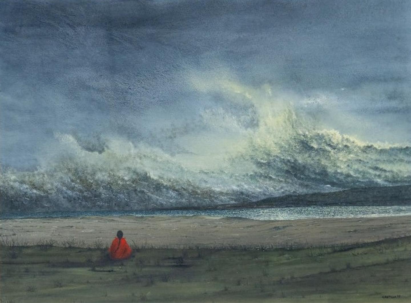 Patricio Castilla semble également fasciné par les éléments. Si son épouse figure dans beaucoup de ses tableaux, certaines toiles ne représentent que des paysages, sans présence humaine en vue. Le ciel, la mer et la lumière sont les seuls sujets visibles. Des vagues denses, à l’aspect presque minéral, montent à l’assaut de nuages éthérés. La palette de l’artiste se déploie dans toutes ses nuances : des gris, des bleus, des verts mais aussi des jaunes composent des atmosphères lumineuses singulières.