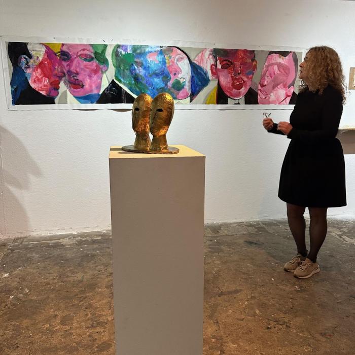 Les œuvres de Barbad Golshiri s’inscrivent dans une tonalité plus sombre. Une peinture à l’encre de Chine et à l’acrylique sur bois montre un bébé amputé lisant un livre, image troublante qui dialogue avec une série de petites sculptures en plâtre et gomme-laque. Ces reliefs aux allures de fragments funéraires, réunis sous le titre D’un ouvrage abandonné, évoquent des traces archéologiques d’histoires interrompues.