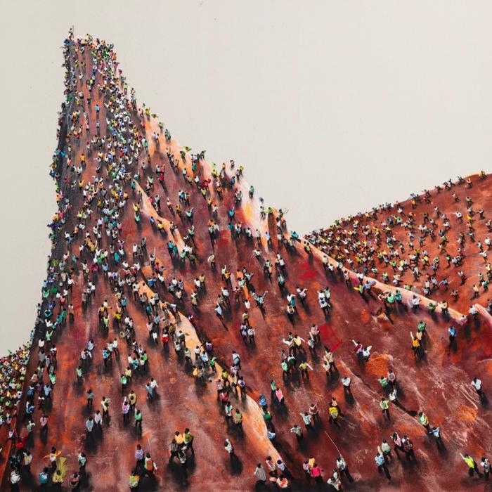 Les figures humaines, signature de l’artiste depuis la fin des années 1990, apparaissent ici dans toute leur complexité. Toujours peintes en noir, elles se distinguent par des vêtements colorés qui rythment la surface picturale. Parfois, ces silhouettes ne sont pas seulement représentées mais littéralement intégrées à la matière : réalisées en relief à partir de coquillages, de tubes de peinture, de capsules de bière ou de fragments de tissu, elles surgissent du support. Parfois, l’artiste va jusqu’à glisser un portrait miniature au milieu de ces éléments. Ce recours à des matériaux inattendus crée un subtil trompe-l’œil, renforcé par les ombres portées qui ancrent les personnages dans l’espace du tableau tout en accentuant leur présence physique.