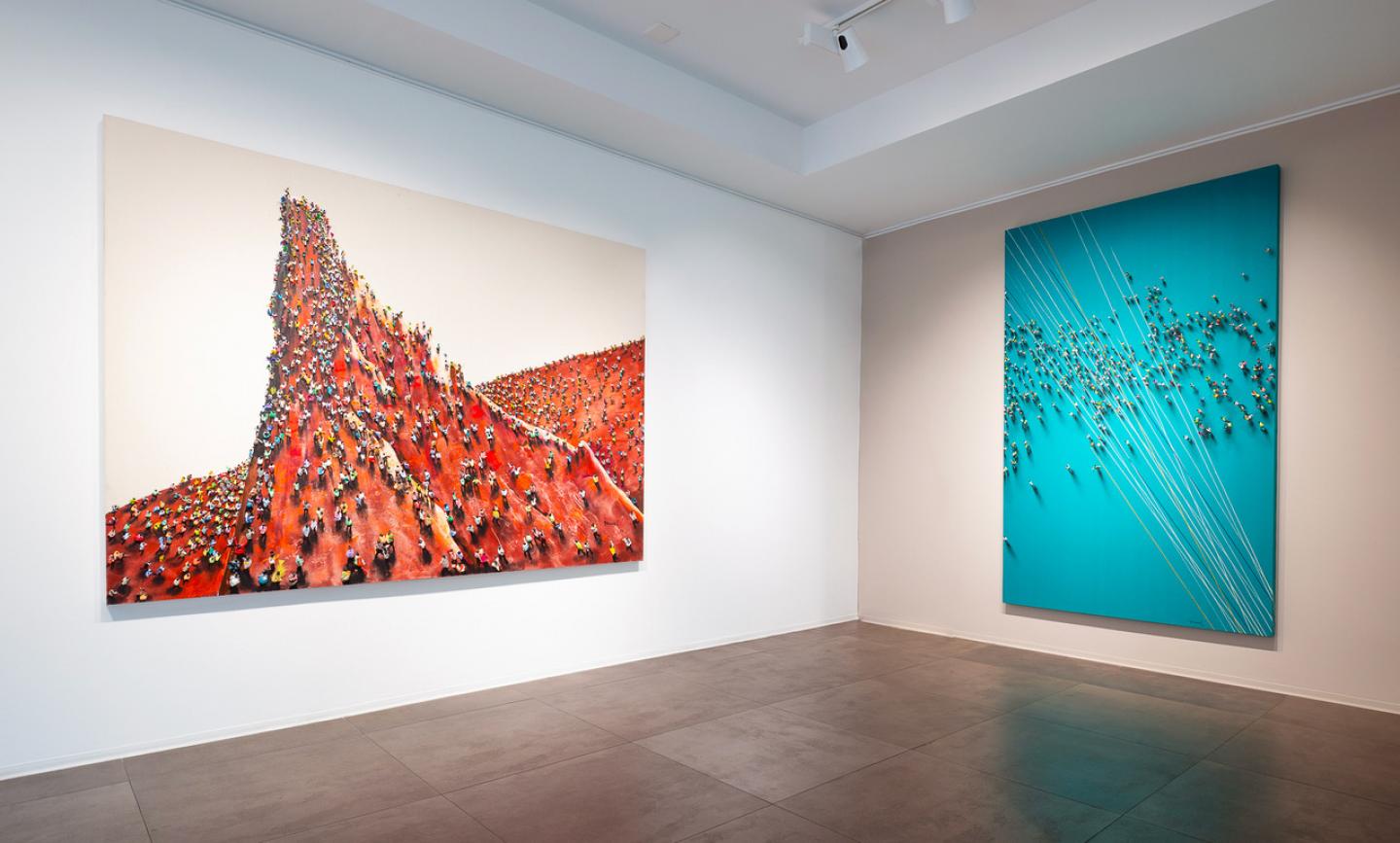 D’emblée, le visiteur est saisi par l’ampleur des formats. De grandes surfaces colorées, traitées de manière abstraite, servent de théâtre à une multitude de minuscules personnages. Vue de loin, la toile se donne comme une composition presque minimale ; de près, elle se révèle d’une richesse foisonnante. Ce jeu d’échelle est au cœur du travail de Genovés : il oblige à circuler physiquement devant l’œuvre, à ajuster sans cesse son regard entre vision globale et immersion dans le détail.