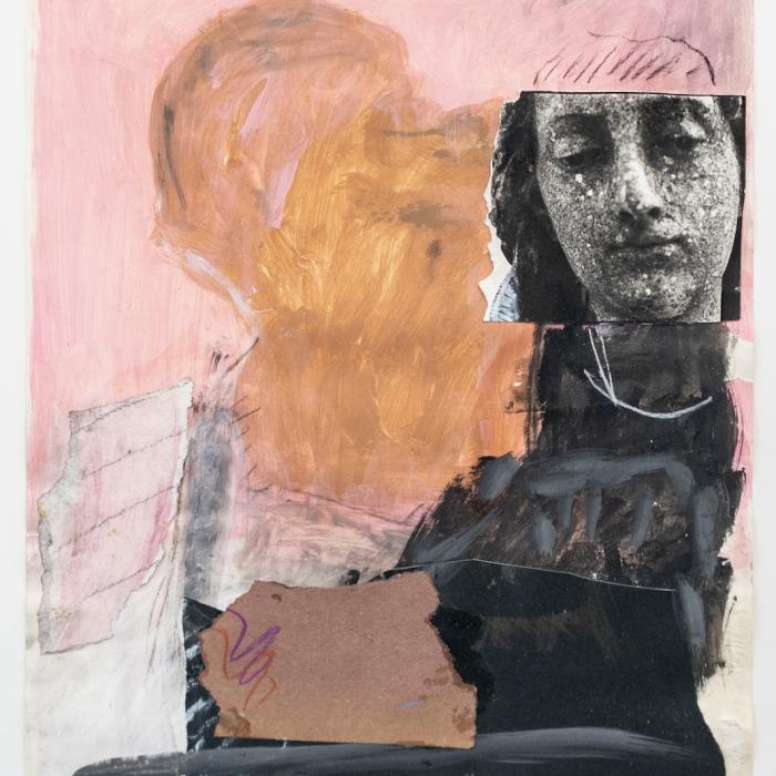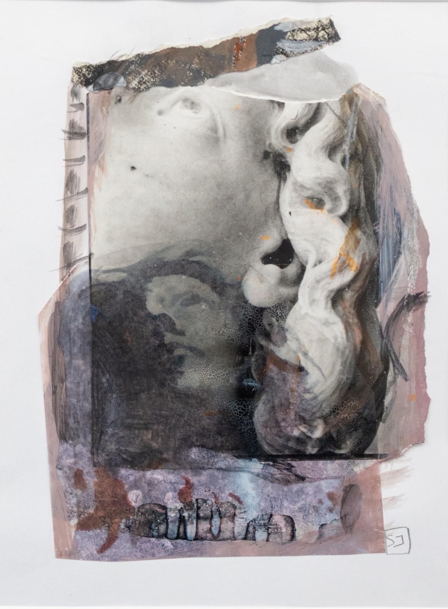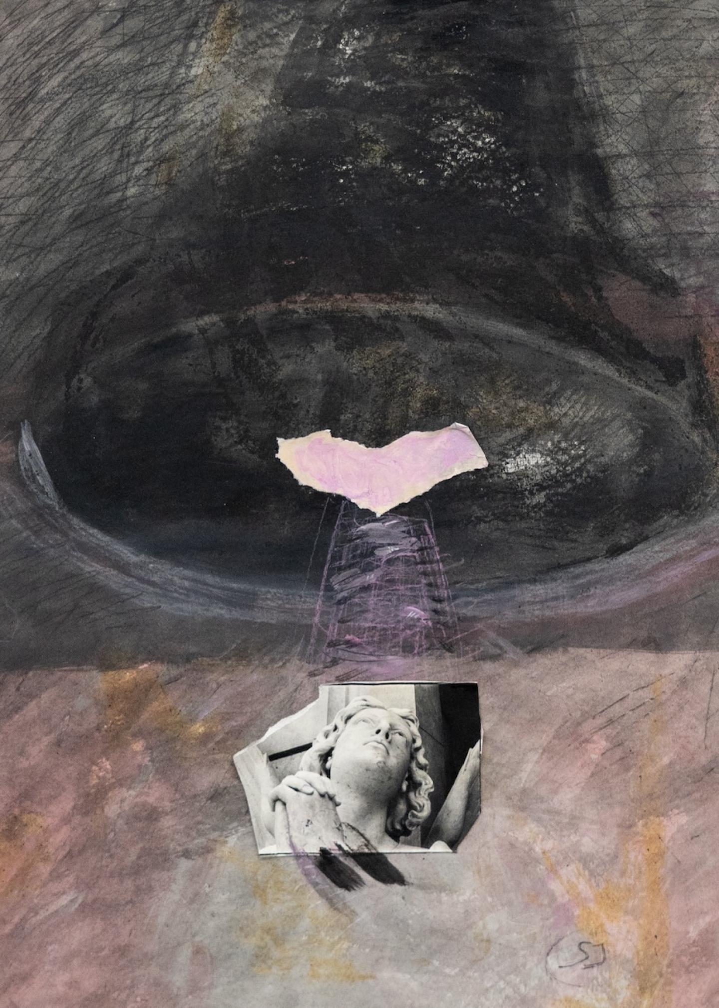 Lors de la visite, une mélancolie douce se dégage des œuvres de l’artiste, mais leur beauté n’est pas exempte d’une certaine ambiguïté. D’emblée, les couleurs douces de sa palette – roses tendres et bleus subtils – conjuguées aux traits délicats des statues frappent le regard. Mais plus on les regarde et plus leur noirceur émerge : les nuances sombres et l’aspect brut de la matière se révèlent. Le papier parfois laissé nu, les bords déchirés des photos et la nervosité des coups de crayon ou de pinceau teintent les compositions d’une sourde violence.
