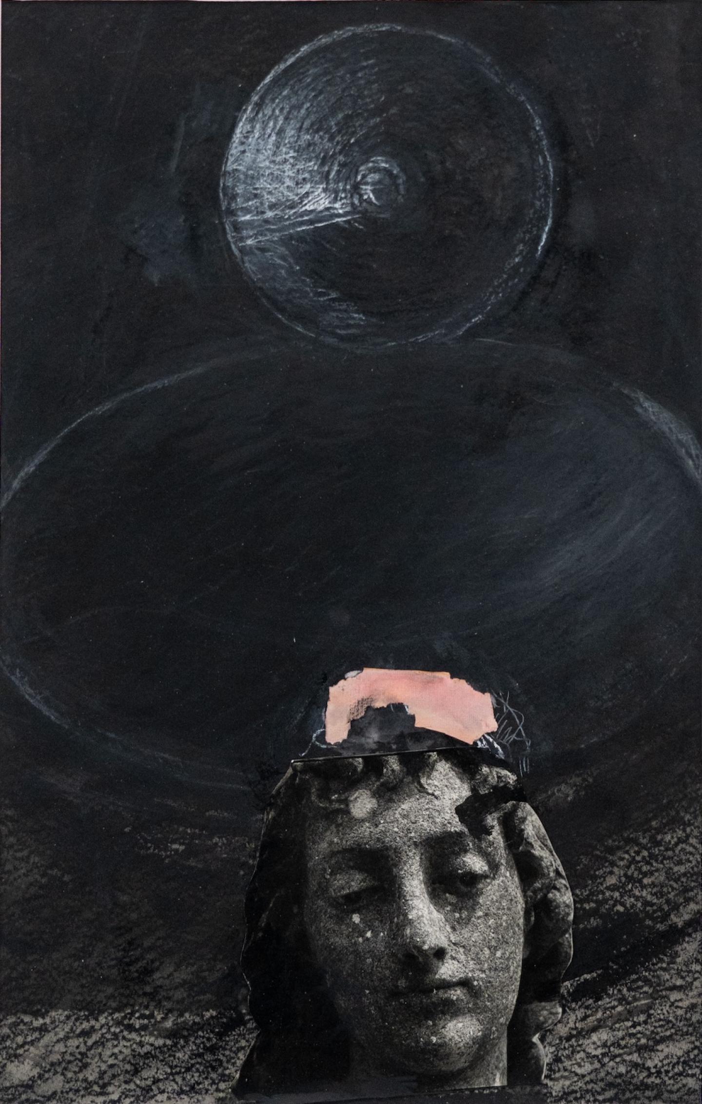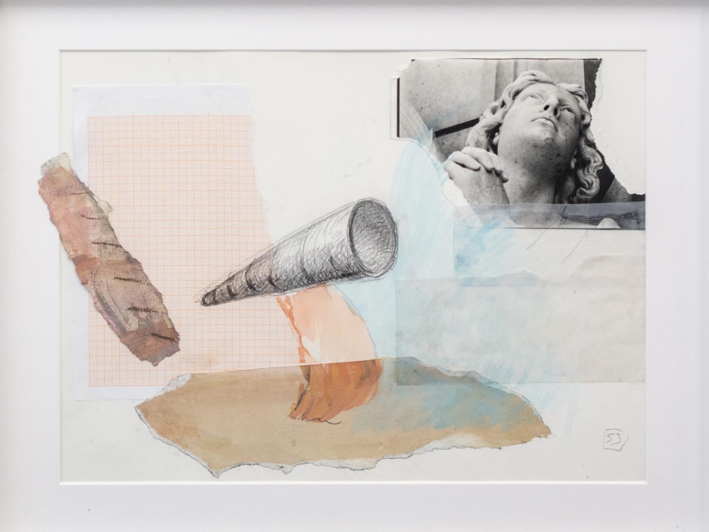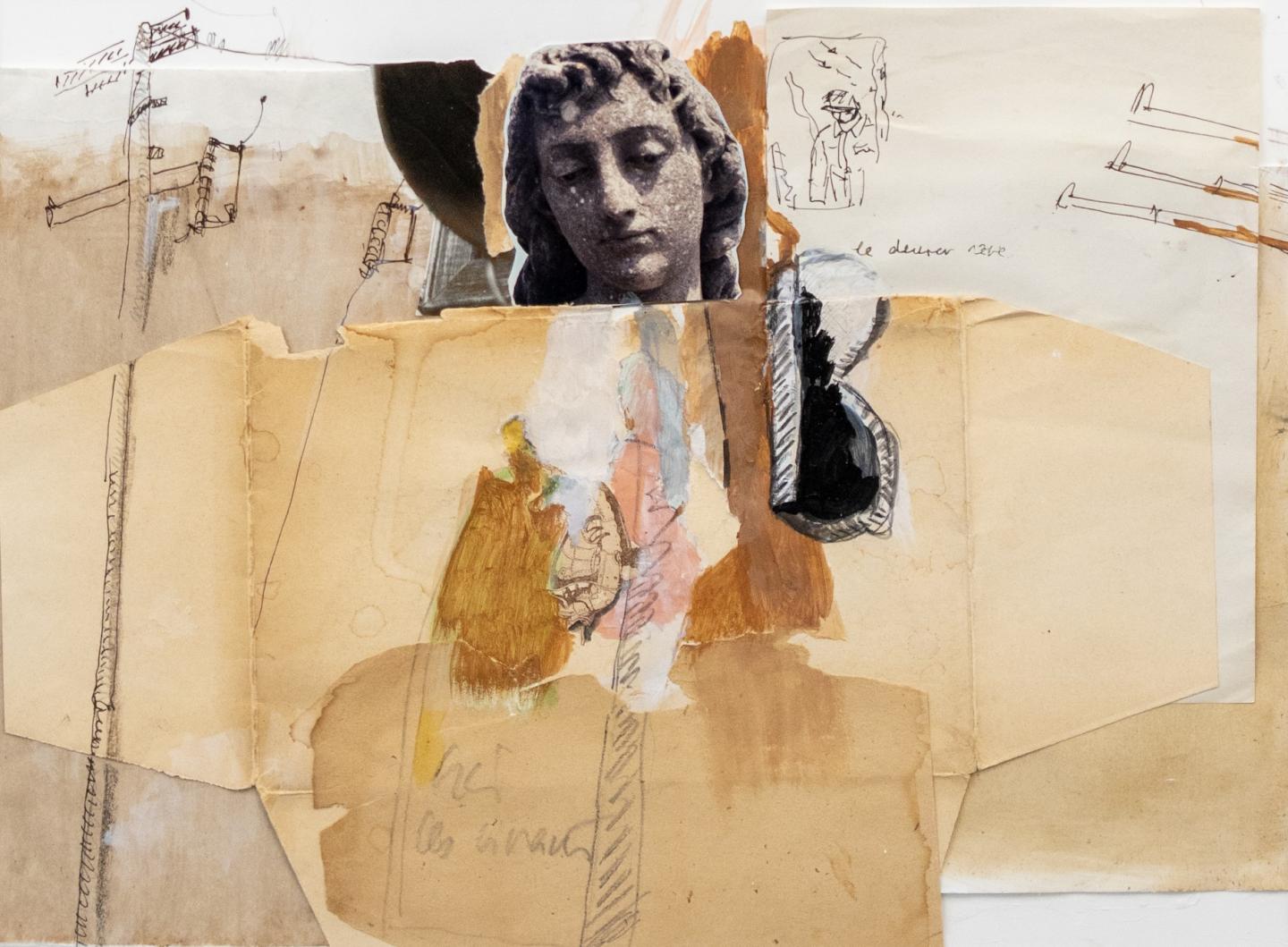 Lors de la visite, une mélancolie douce se dégage des œuvres de l’artiste, mais leur beauté n’est pas exempte d’une certaine ambiguïté. D’emblée, les couleurs douces de sa palette – roses tendres et bleus subtils – conjuguées aux traits délicats des statues frappent le regard. Mais plus on les regarde et plus leur noirceur émerge : les nuances sombres et l’aspect brut de la matière se révèlent. Le papier parfois laissé nu, les bords déchirés des photos et la nervosité des coups de crayon ou de pinceau teintent les compositions d’une sourde violence.